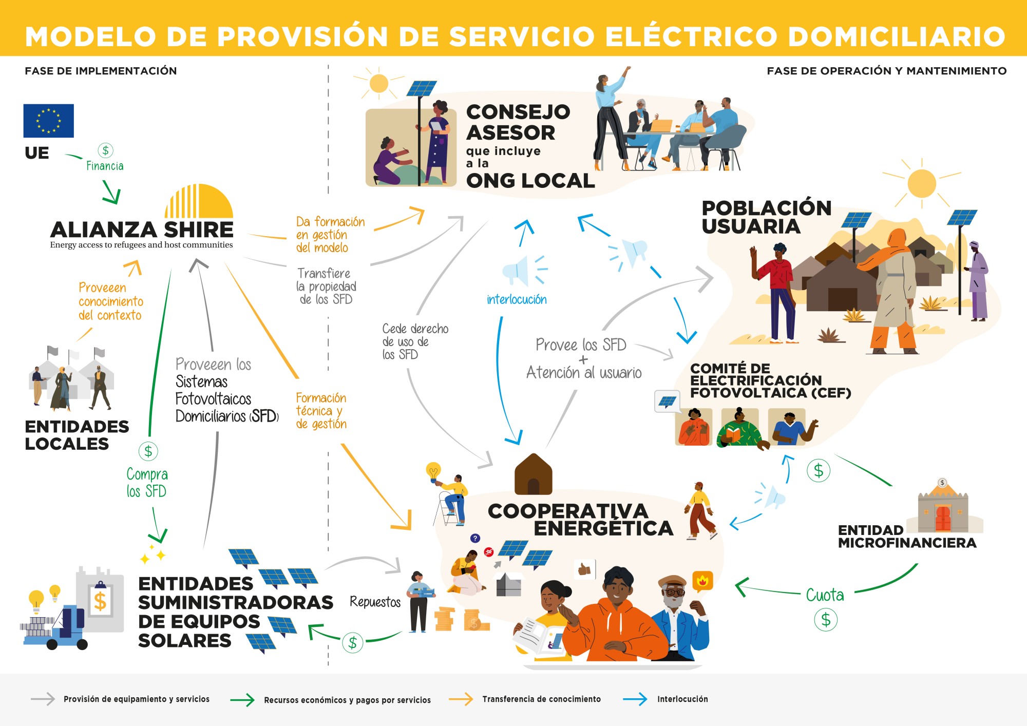Más concretamente, la cooperativa está desplegando los sistemas de acceso a energía solar fotovoltaica en 2000 hogares, instalando los sistemas solares domiciliarios; está realizando funciones de mantenimiento, reparación y sustitución de componentes eléctricos dañados; y también realiza tareas de gestión financiera, ya que es la entidad que firma los contratos con los usuarios, cobra la cuota, o gestiona el fondo de reposición para sustituir la batería de los sistemas solares domiciliarios al final de su vida útil.